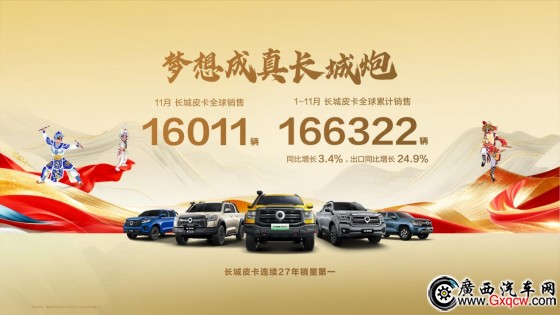 目前,長(zhǎng)城皮卡已連續(xù)27年銷量第一,全球累計(jì)銷量突破285萬(wàn)輛。1-11月,長(zhǎng)城皮卡全球累計(jì)銷售166322輛,同比增長(zhǎng)3.4%。1-11月,海外累計(jì)銷售58070輛,同比增長(zhǎng)24.9%,其中11月銷售6534輛,同比勁增43.2%。長(zhǎng)城炮以絕對(duì)銷量?jī)?yōu)勢(shì),獲得強(qiáng)勢(shì)、出彩的國(guó)內(nèi)外市場(chǎng)表現(xiàn),穩(wěn)居中國(guó)皮卡國(guó)內(nèi)、出口銷量雙第一。