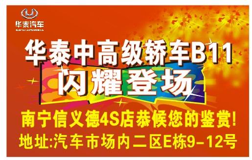 2011年4月14日-17日,第十七屆廣西汽車(chē)春季交易會(huì)在南寧市安吉大道41號(hào)廣西汽車(chē)交易市場(chǎng)內(nèi)隆重舉行。在車(chē)展期間,華泰汽車(chē)首款中高級(jí)轎車(chē)B11將在南寧市信義德4S店閃耀登場(chǎng),現(xiàn)場(chǎng)可接受預(yù)訂!歡迎廣大車(chē)友蒞臨鑒賞