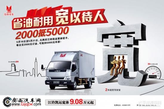 三十多年來,江鈴汽車始終堅(jiān)持以客戶為中心,致力于打造能夠滿足用戶需求的高質(zhì)量產(chǎn)品,與此同時(shí),企業(yè)也一直在思索,如何在價(jià)格上使產(chǎn)品更親民,讓更多用戶能夠買得起、用得上夢寐以求的好車。即日起至5月31日凡到店購江鈴凱運(yùn)寬體輕卡即可享受交2000元訂金抵5000元購車款。歡迎廣大朋友到廣西江鈴安吉4S店選購.咨詢熱線:0771-3119811.