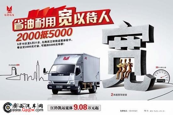 據(jù)獲悉,即日起至5月31日到廣西江鈴4S店購江鈴凱運寬體即享存2000元至少抵5000元的限時優(yōu)惠活動,限時鉅惠,歡迎廣大感興趣的客戶朋友抓緊時間到店搶購。咨詢熱線:0771-3119811.