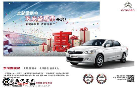 為迎接全新愛麗舍上市兩周年、沖擊WTCC雙聯(lián)冠,8月1日起,東風(fēng)雪鐵龍正式啟動全新愛麗舍“榮耀兩周年 成就雙冠王”雙慶盛惠季感恩回饋消費者行動,為廣大喜愛全新愛麗舍的用戶獻(xiàn)上驚喜大禮!凡是到店購買全新愛麗舍的用戶,即可參與微信掃描二維碼活動,贏取3000元雙慶紅包。