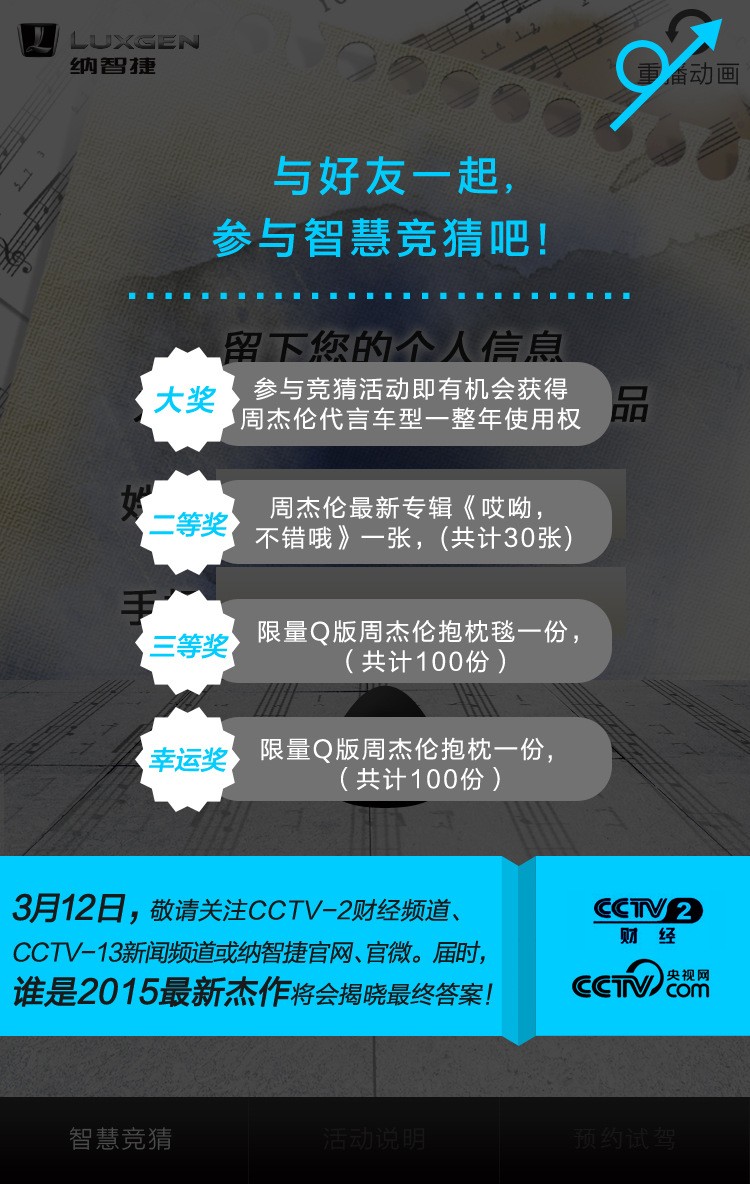 參與“智慧競猜”活動,答對周杰倫代言車型,即有機(jī)會獲得限量版禮品!還有機(jī)會獲得與周杰倫近距離接觸的驚喜哦~