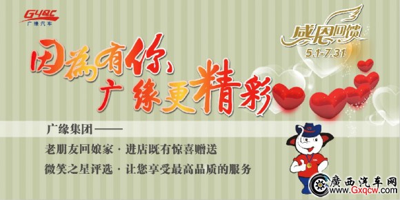 5月5日起至7月31日,春夏接替,冷熱相間,廣緣集團(tuán)給您滿滿的實(shí)惠,為您送上全面而周到的售后維修保養(yǎng)服務(wù)。只要您是廣緣車主,廣緣汽車旗下五大品牌4S店(雷克薩斯、廣汽豐田、一汽豐田、廣汽本田、東風(fēng)日產(chǎn))進(jìn)店即有驚喜,多重清涼優(yōu)惠送不停。來(lái)保養(yǎng)送保養(yǎng),參與廣緣集團(tuán)2014微笑之星評(píng)選活動(dòng),選出您心目中廣緣集團(tuán)服務(wù)**,笑容最甜美的明日之星。