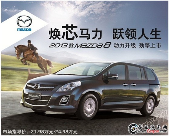 動力升級價格不變,2013款Mazda8震撼上市!在保持大氣時尚外觀、創(chuàng)新多變空間的基礎上,搭載了全新動力組合,并新增倒車雷達等實用配置。其動力性、舒適性、經(jīng)濟性均實現(xiàn)大幅躍升。在動力升級后更能全面地滿足用戶需求,成為事業(yè)和生活兩相兼顧的都市商務新貴們青睞的好伙伴。目前,廣西鑫廣達一汽馬自達2013款馬自達8已到店,感興趣的朋友歡迎到店品鑒!